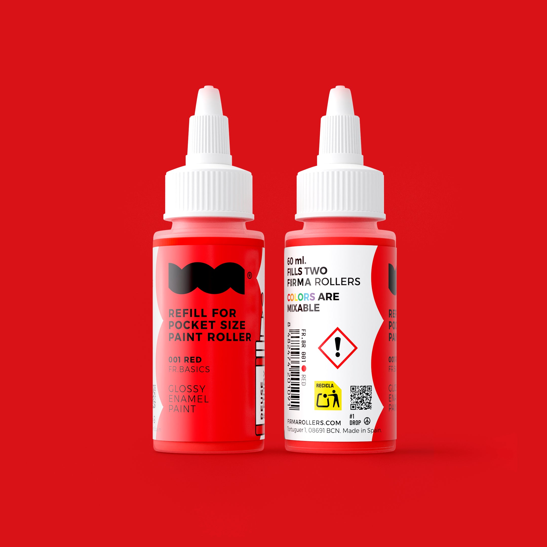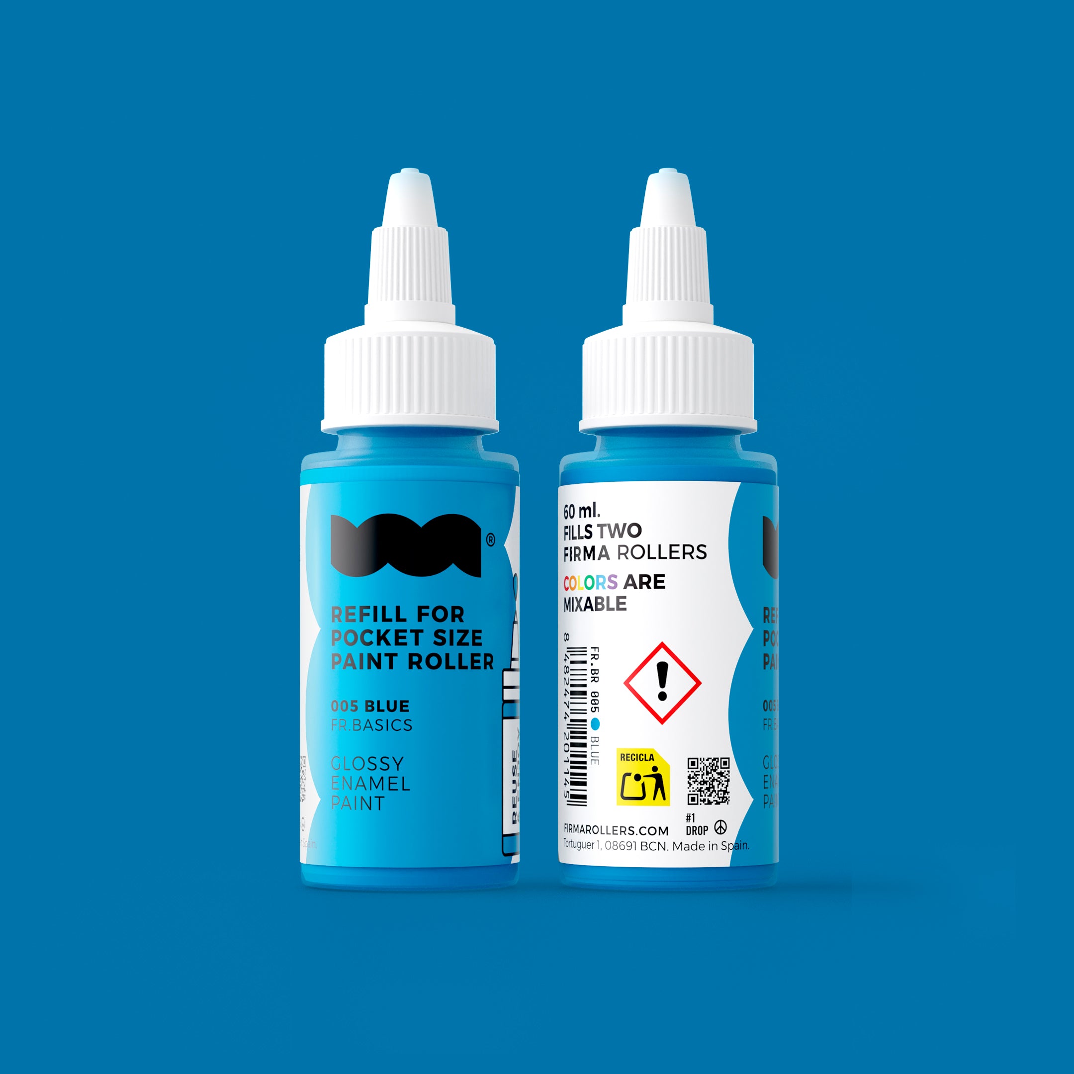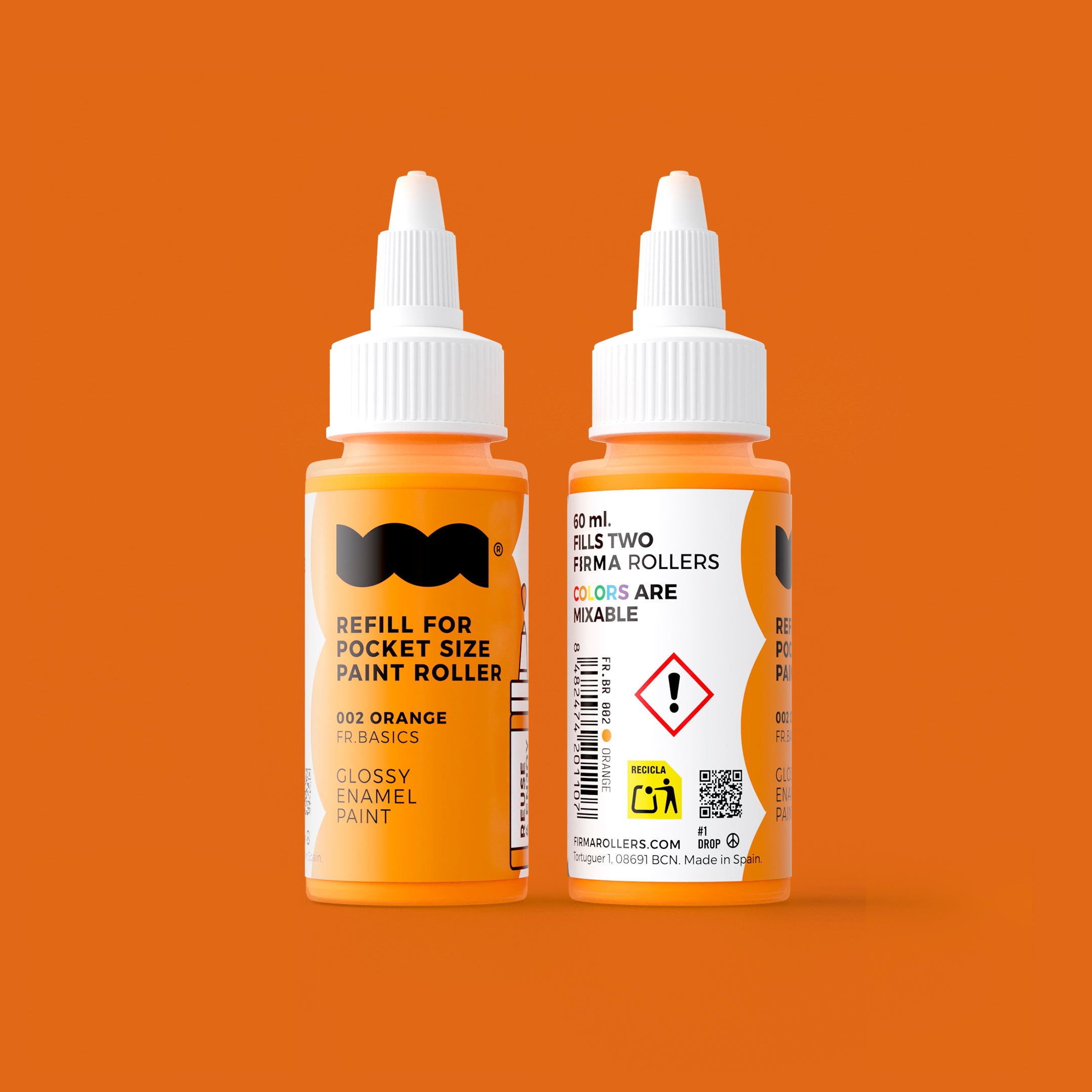 Tinta de RECARGA de 60ml para rolos de bolso FIRMA. Tinta de esmalte brilhante com tampa de rosca que facilita o despejo e evita salpicos. As tintas são misturáveis entre si, permitindo criar infinitas cores.